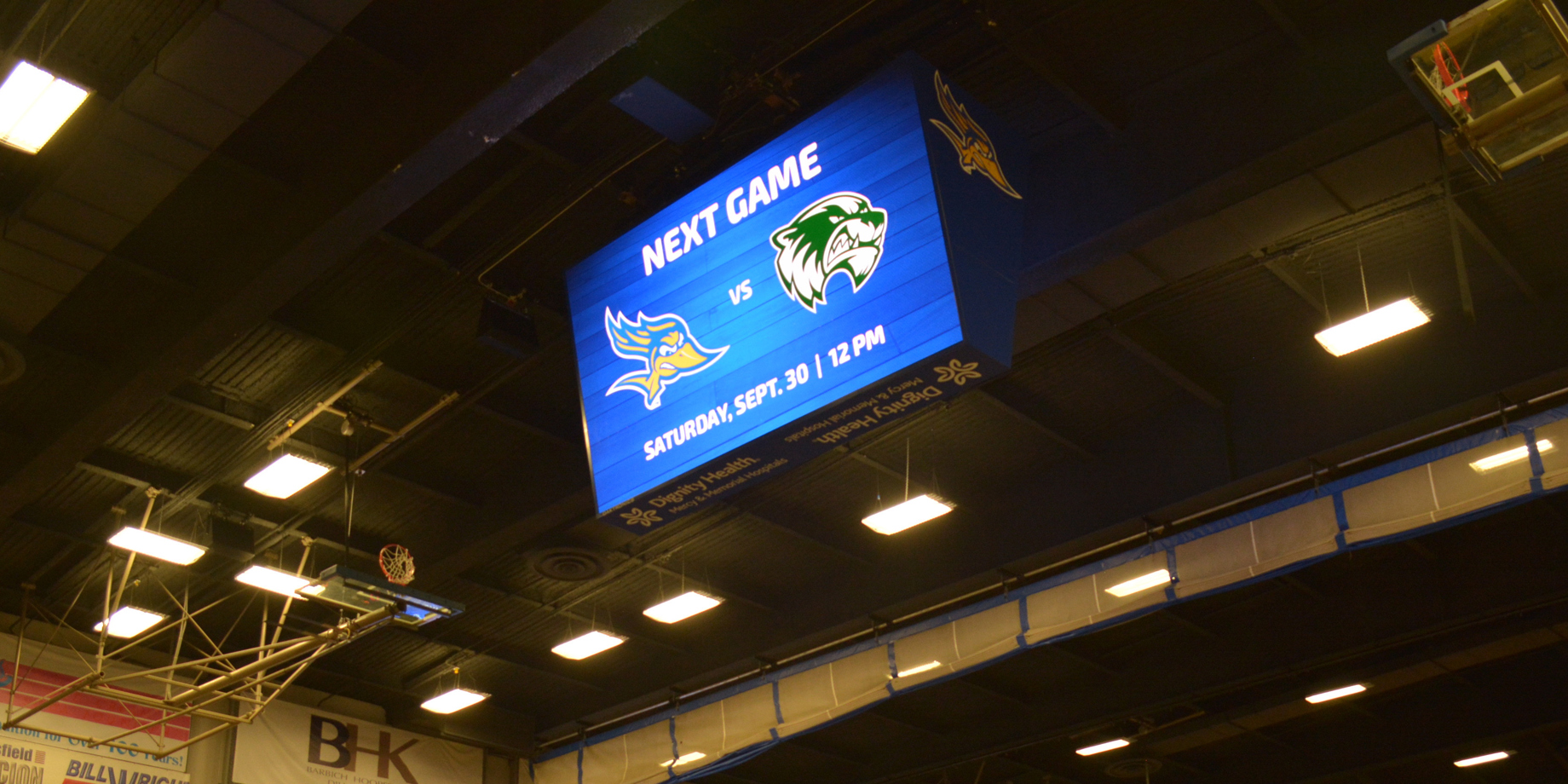 It’s that time of year – college basketball has finished up with exhibition games and the regular season starts this weekend. With all the basketball excitement going on, I wanted to talk about a trend that has been happening in college basketball facilities around the country. What do you think of when you hear of a “centerhung” display system? Is it something that is big that hangs from the roof/ceiling of an arena that is home to a professional sports team and has a lot of displays on it? Well, what if I told you that this isn’t the only option when considering a centerhung display system for your venue and that there is lighter and more cost-effective solution? It’s common to think of something that has four sides, ribbon displays and, as of late, displays underneath for those sitting closer to the action. This is not always the case…