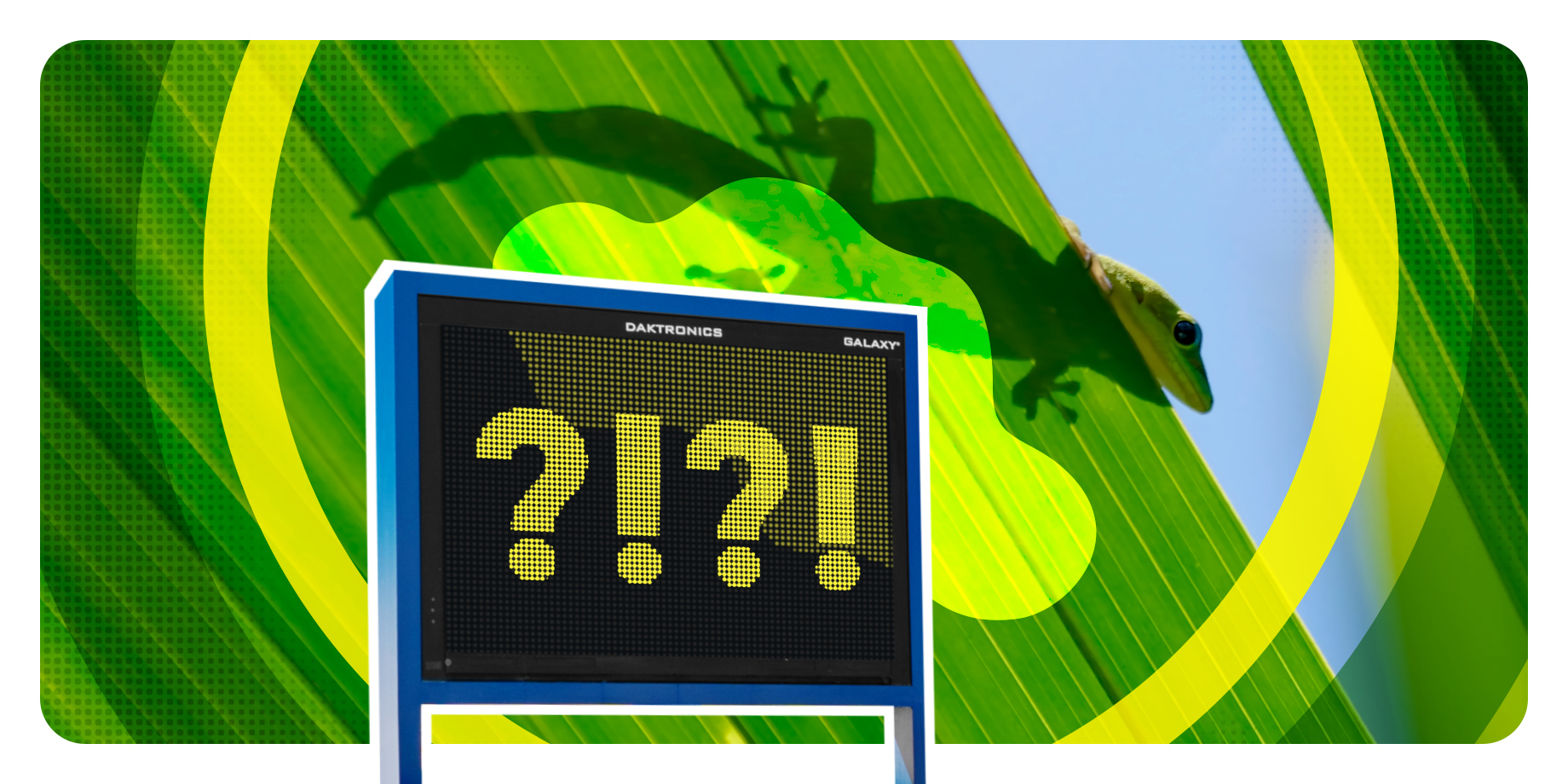 “While looking at it, they noticed there is some weird sticky substance found randomly on several mods, which was strange,” says Jen Adams, Image Quality Specialist at Daktronics Lab Services. “Then we find out cute little lizards have been seen crawling on the display. Somebody (not sure who, but I assume they have small children at home) makes the logical jump from weird sticky substance to: 'Are lizards urinating on our modules!?'”
