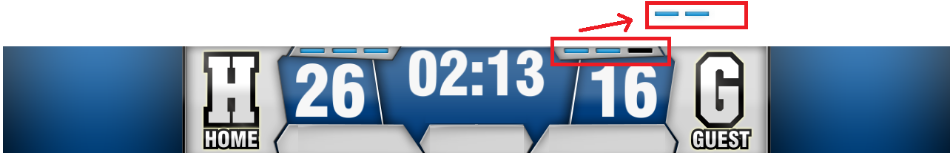 Timeouts are typically, brightly colored dashes or shapes are used as the indicators for time outs on top of solid colored backgrounds. Often, place holders for used time outs will be slightly greyed out or darkened to indicate where they will go.
