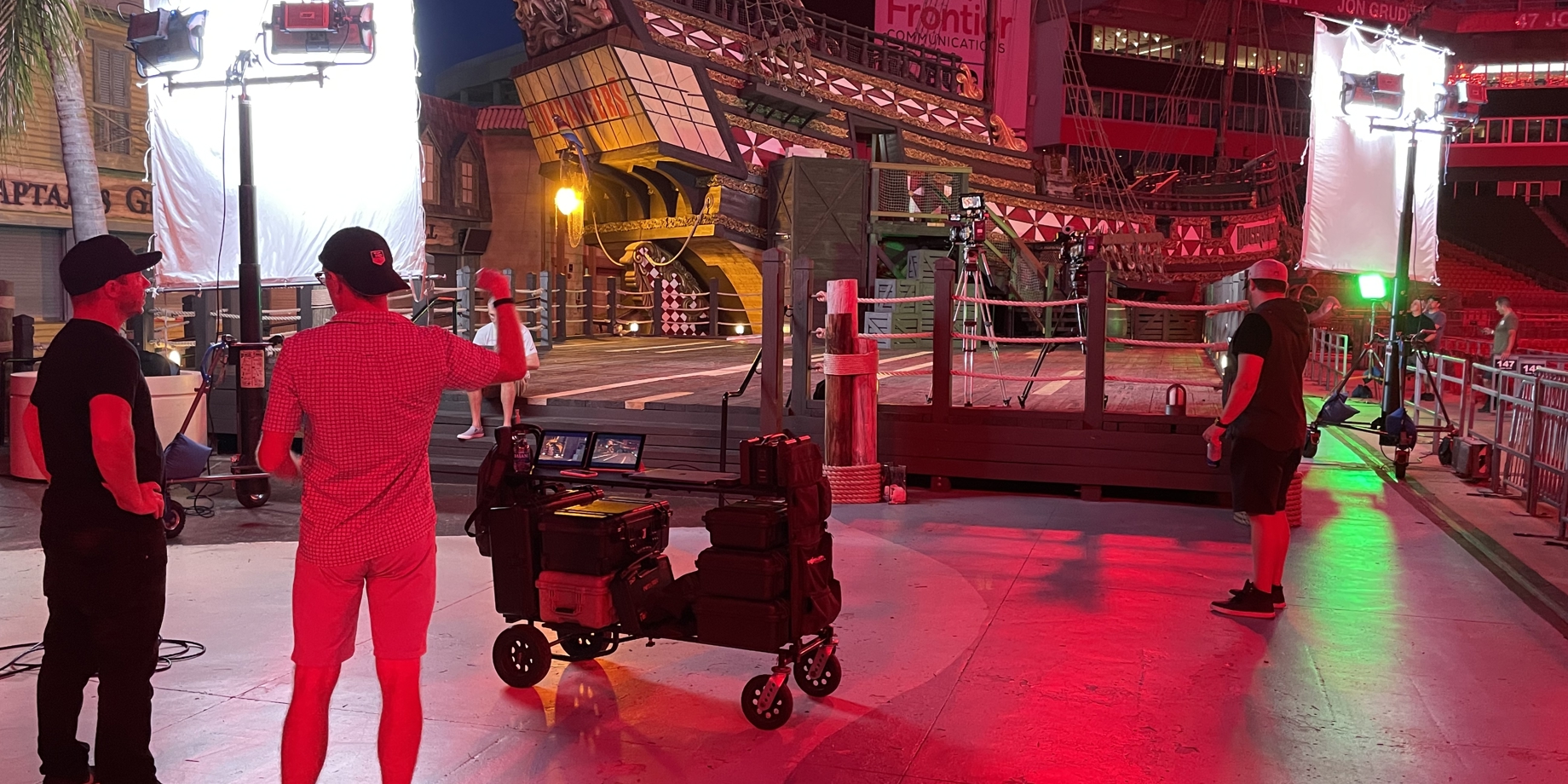 Similarly, Creative Services showed up in Tampa Bay to help professional football’s champion Buccaneers get ready to defend their title! Well, not the actual team and their practices, but with the cheerleaders intro video and two “bump” videos.