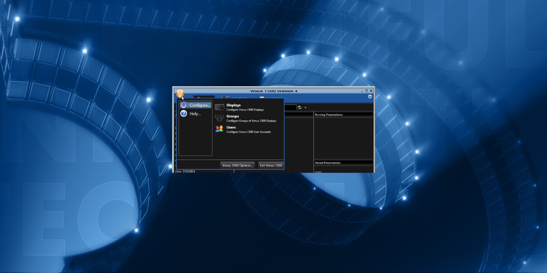Now that you know what it looks like and where it can be found, we can start talking about what it does. From the Application Menu (Orange V) you can Configure displays and create display groups, and user accounts.