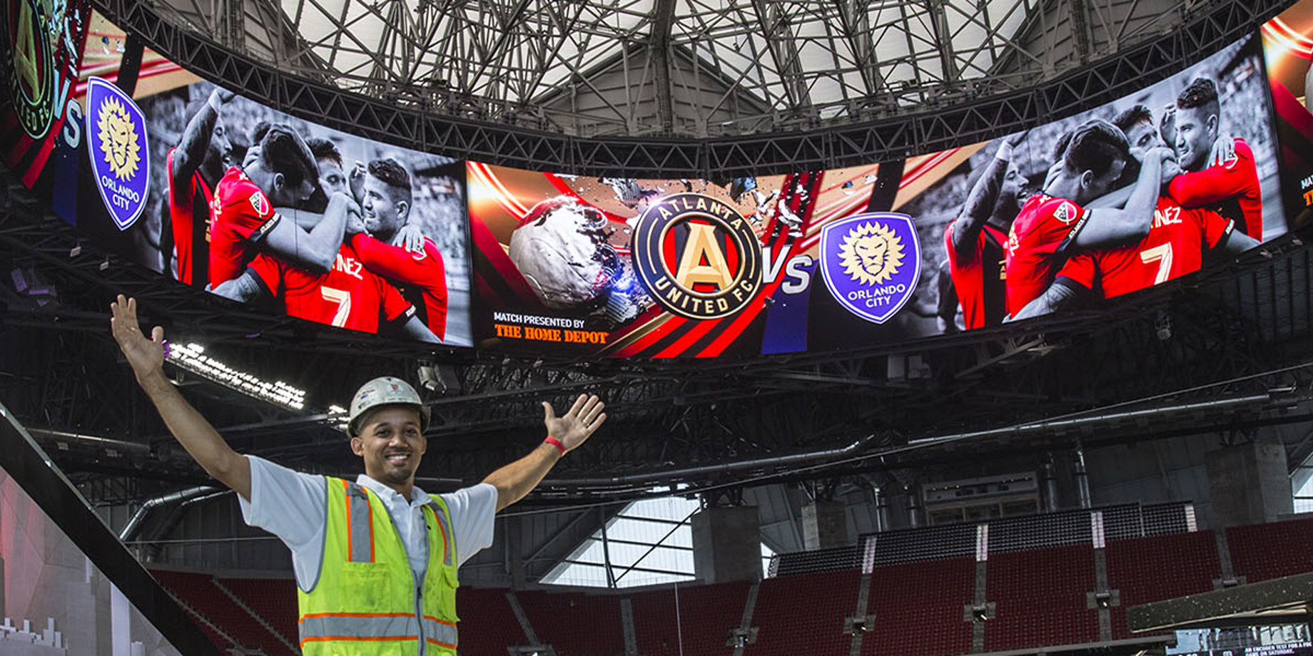 This past summer we were excited to start installation of the unprecedented and popular Halo video board at Mercedes-Benz Stadium in Atlanta. Now, with the NFL and MLS seasons underway, the Halo board has been one of the most prominent and memorable features at Atlanta Falcons and Atlanta United FC events. Recently, we took a behind the scenes tour with our lead field service engineer to find out what it took to truly light up the scoreboard and install the largest video scoreboard in the world and this integrated LED system.