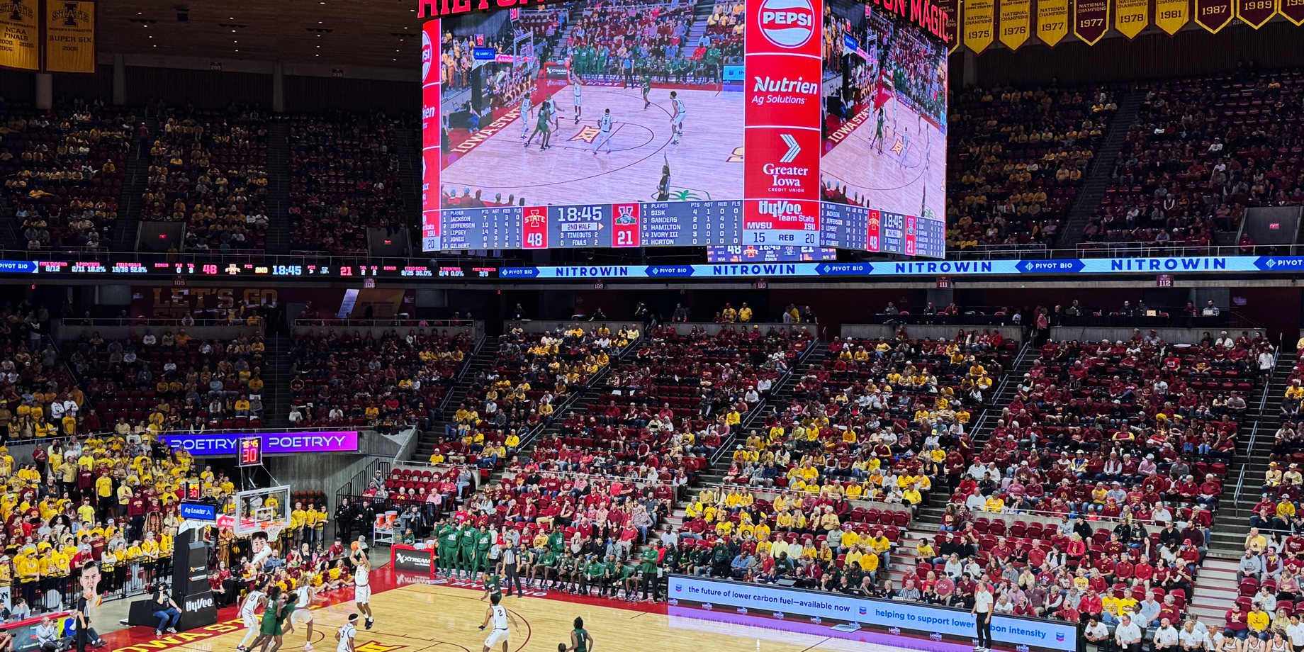 With the addition of a full Daktronics control system upgrade in Aimes, IA, Cyclones fans taking in basketball and volleyball games at Hilton Coliseum now enjoy a fresh GIP layout fully powered by Camino. The rounded 3.9mm pixel pitch centerhung structure design lends itself seamlessly to an immersive lower bar for game information and stats flanked by vibrant sponsor pillars that scream Cyclones red that contrast white sponsor logos on the corners. Operators designed various alternate looks for the bottom bar including larger team and individual stats along with color-coded bar graphs for team stats. With the Camino editing hardware and software included, the ISU creative staff, led by Associate Directors Phil Manley and Austin Minnihan, wasted no time making their own additions and customizations to the Daktronics-provided Camino templates.
