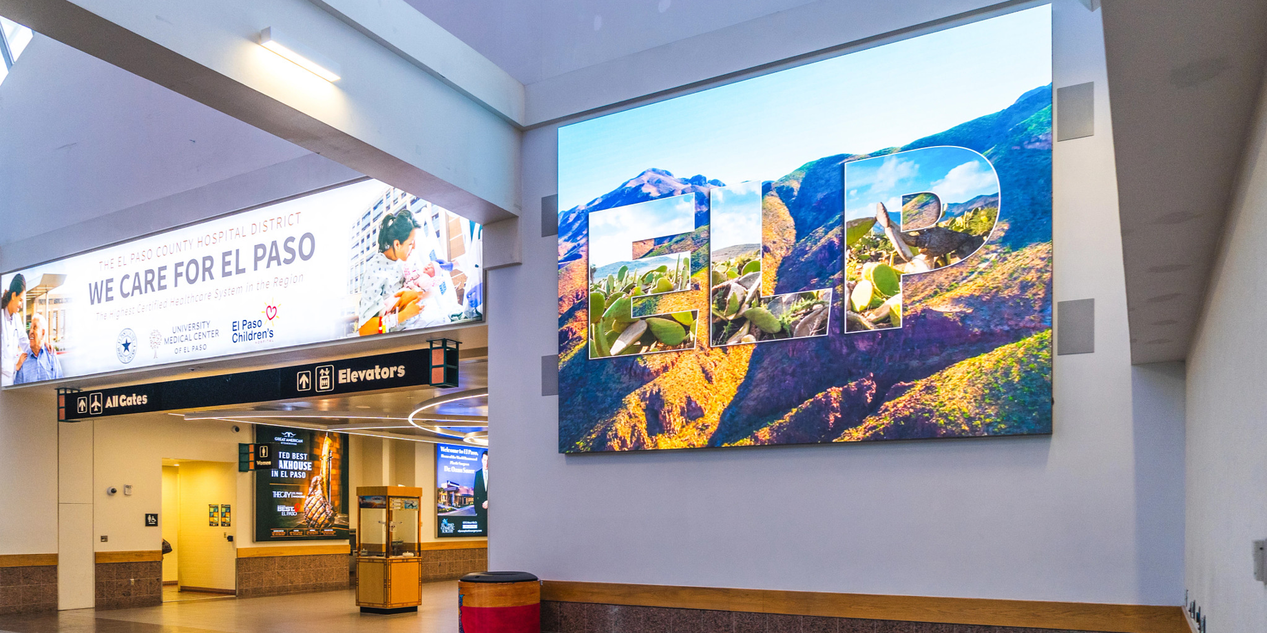 Daktronics Chip on Board (COB) technology delivers high-resolution, color-rich LED displays with superior durability, impact resistance, and energy efficiency. These lightweight, touchable displays are ideal for high-traffic airport areas like ticketing and at the gate, where people view crucial information at a close viewing distance.