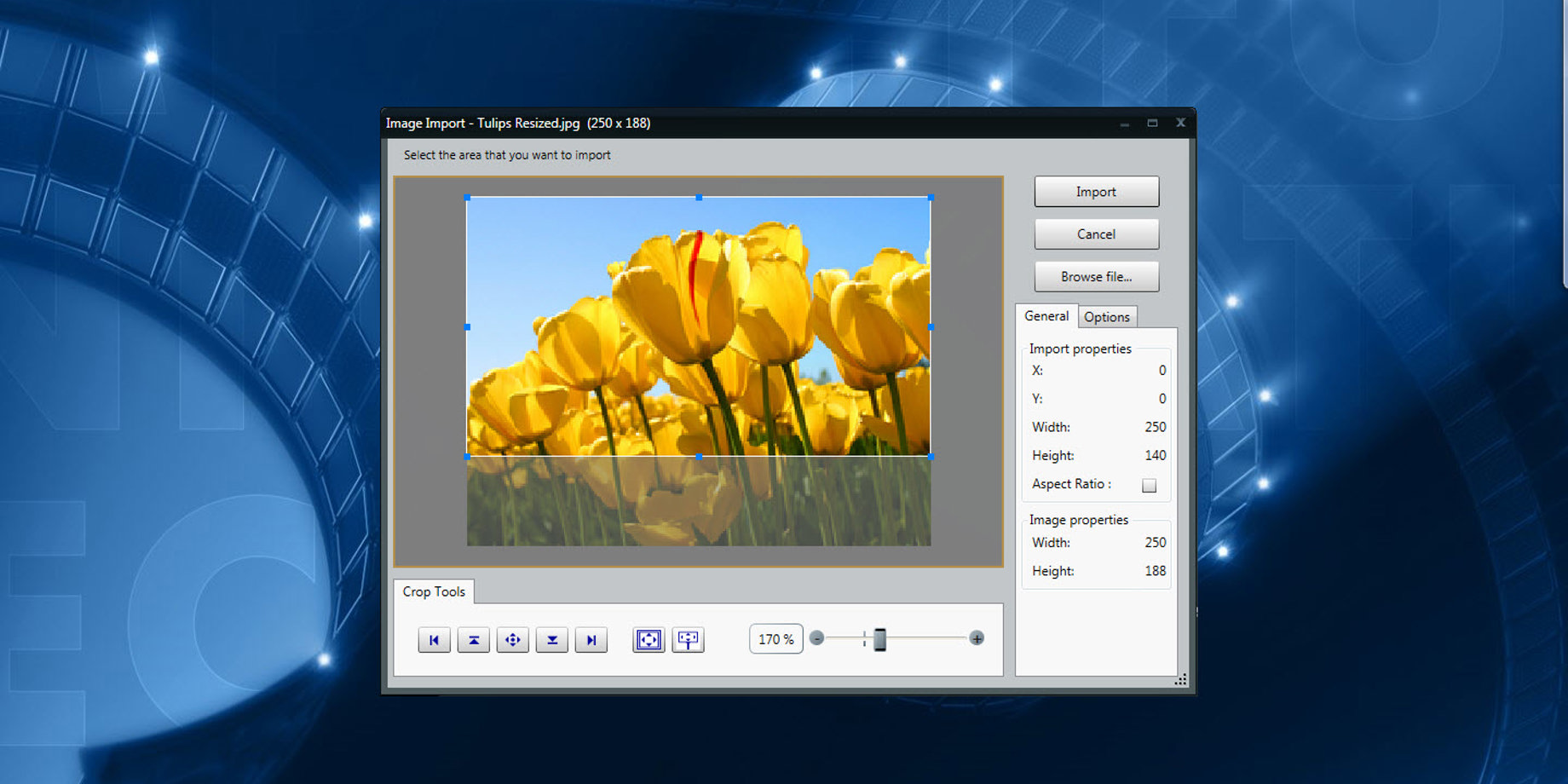 - In the Image Import Window, click on the Crop to Display Icon to select a portion of the image the matches the display dimensions.