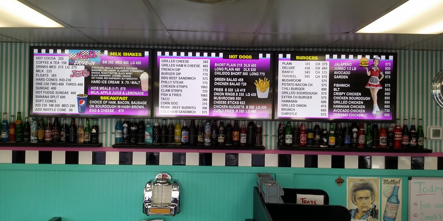 Gregg Collins with Meyer Sign Company has worked with Hal’s Drive-In for years. Hal’s is a true throw-back, with fresh burgers under $5.00, and a jukebox that plays music from the ‘50s. Even with all that retro ambiance, Hal’s still needs to update their menus regularly. That’s why they wanted to update their old manual menu boards to digital.