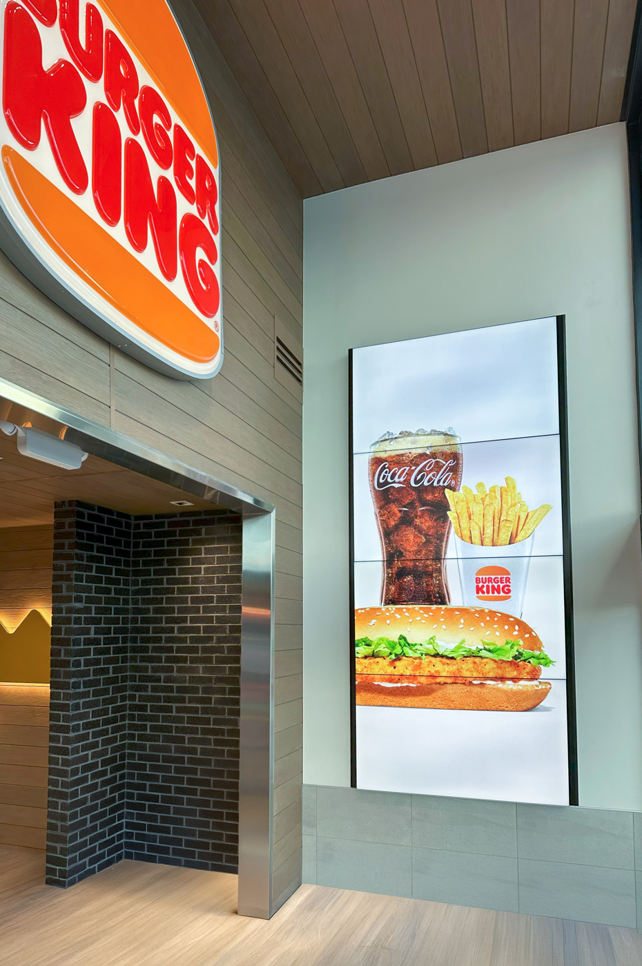 Installed as part of the December 2024 remodel, the video wall is visible from the road and features a mix of local promotions and branded Burger King content. From sizzling Whoppers to refreshing Coke animations, the display captures attention and enhances the in-store experience.