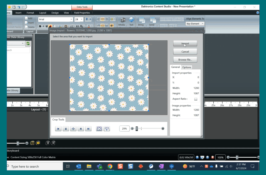 When creating content, make sure the elements used or embedded are also appropriately sized. Even if you create the content to fit your display size, the logos, imagery, and videos embedded need to match your display’s pixels. For example, if you want to place a logo or image in the presentation, first identify where and how much space the element will occupy on your display, roughly estimating its size in pixels.