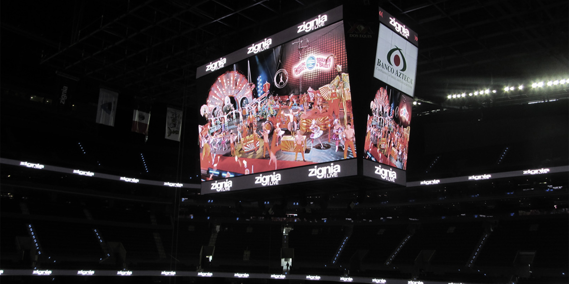 A centerhung is often the focal point of a stadium because it allows spectators to see the action from every seat. They can all be designed differently depending on the needs of the venue. Occasionally they can be used to show one full video image around the entire structure or more frequently the same content is repeated on each face.