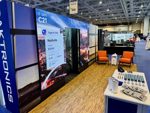 Our Daktronics tradeshow booth at the annual American Association of Airport Executives (AAAE) conference showcased an at-the-gate application. Digital LED technology wrapped around the door-sized opening to a pseudo jet bridge. The vibrant content was designed specifically for this event by Art of Context. The digital display featured video of specific destinations overlayed with flight information as well as traveler updates including instructions signed by an American Sign Language (ASL) interpreter.