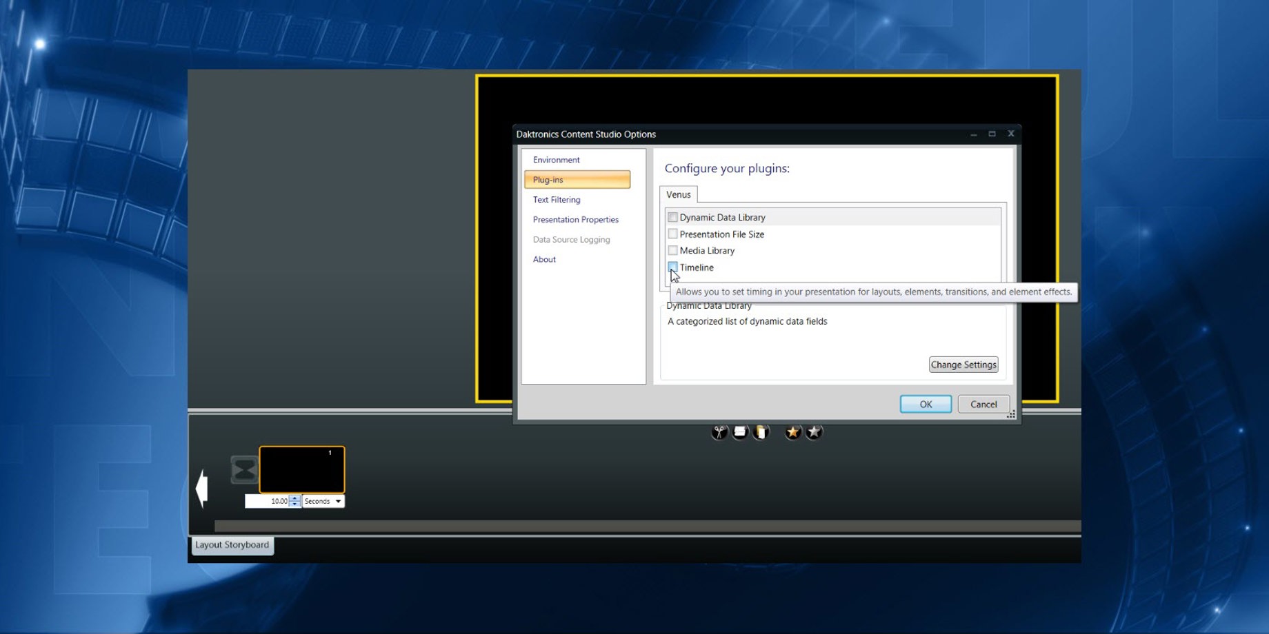 - Click on Plug-ins, found in the Daktronics Content Studio Options window and put a checkmark in the checkbox next to Timeline under Configure your Plugins.