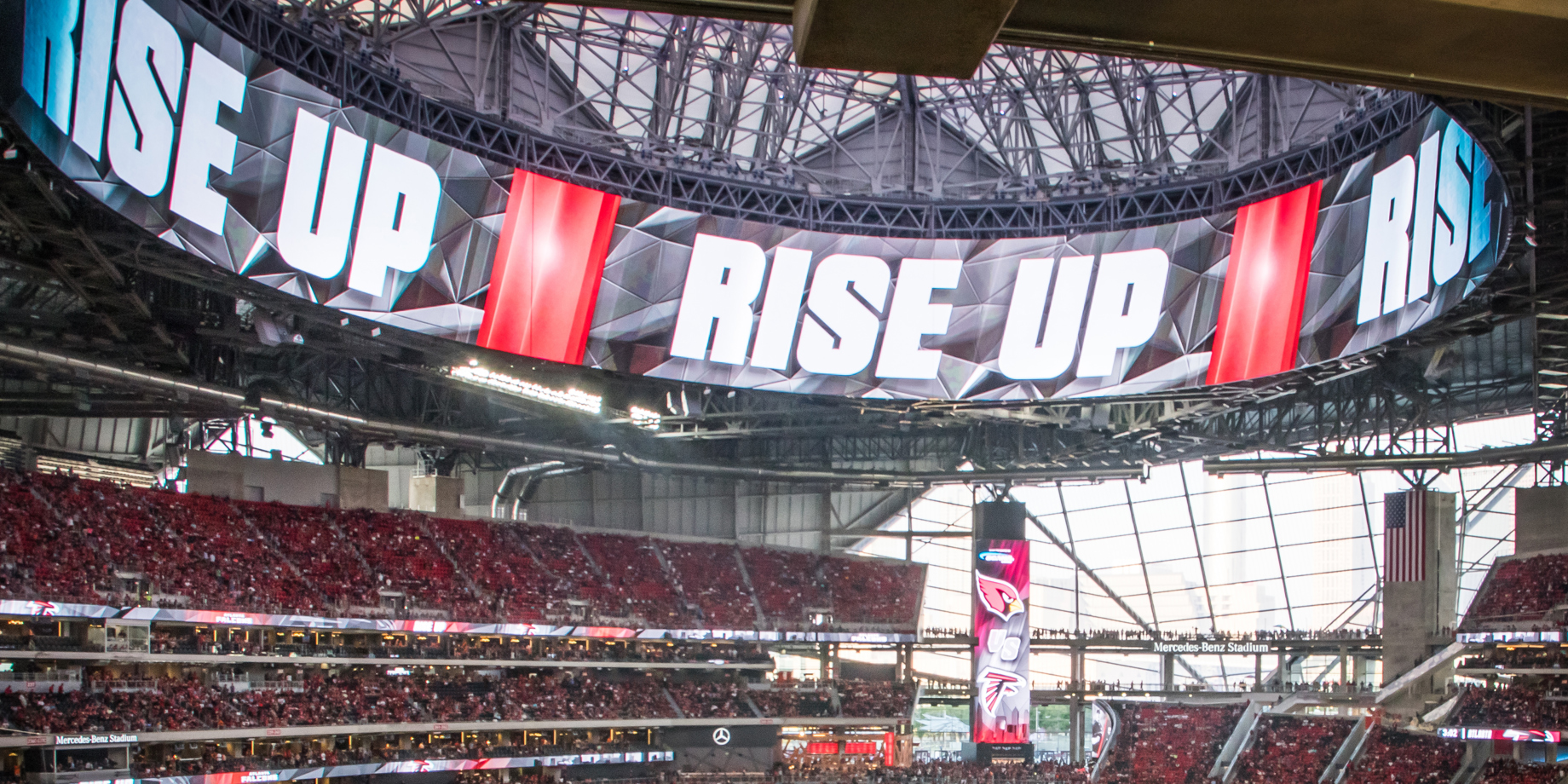 - The Falcons Mega Column Display will have more square footage than 17 NFL teams’ main video displays. And the curved, triangle-shaped Feather Wall Display is blowing people away as they enter the stadium. Fans at Mercedes-Benz Stadium are in for a technological treat.