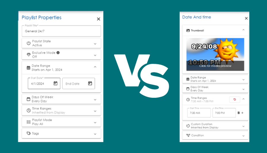 To achieve optimal scheduling results, consider using a combination of Playlist Properties and Media File Properties, especially if you're following the Month-by-Month or Umbrella scheduling methods outlined in our Spring-cleaning blog. Set Playlist Properties for the overall date range, and then customize specific files with additional constraints as needed.
