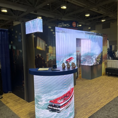 The wayfinding section of the booth showed how digital signage can adapt instantly to operational changes. Using COB in ¼-panel configurations, the display wrapped to replicate modern architectural elements found in terminals.