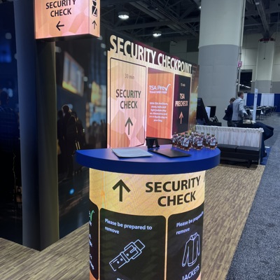 This booth installation invited attendees to step into a reimagined security zone built with COB LED in flexible ¼-panels, enabling a floor-to-ceiling portal that wrapped content cleanly around corners with no visible seams.