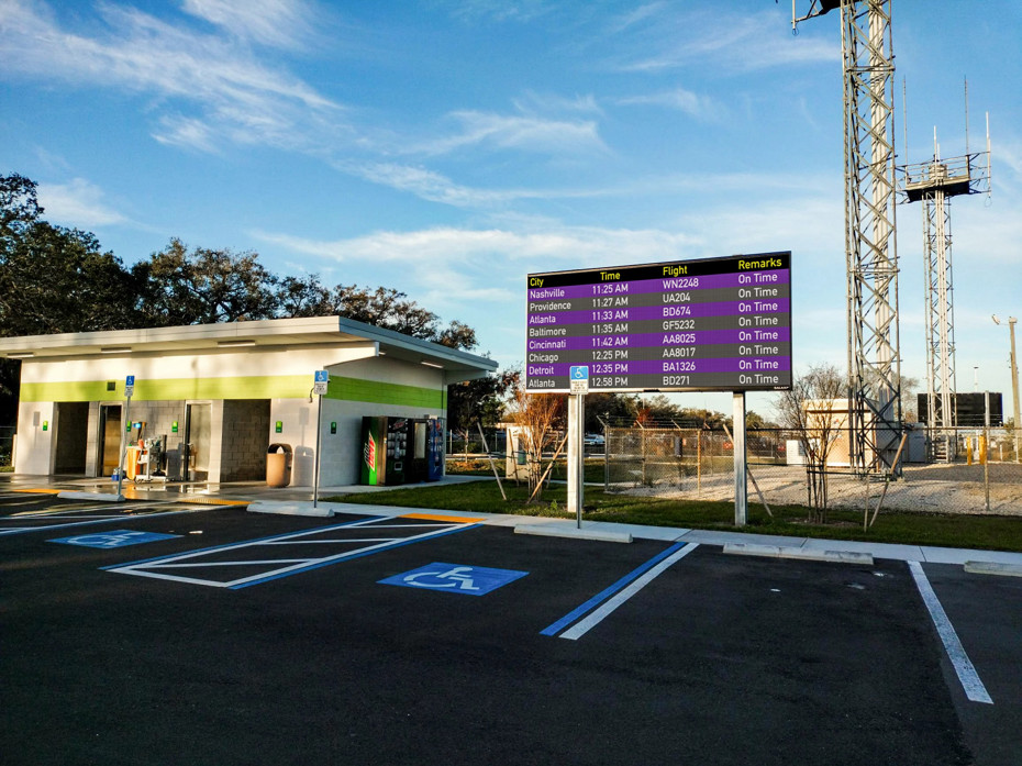 Cell phone lots are increasingly popular at airports. Dynamic LED signs can keep people informed on a granular level with programming that notifies drivers when specific planes land, after checked bags have dropped, and even alert drivers about when they should leave the lot to pick up their travelers.