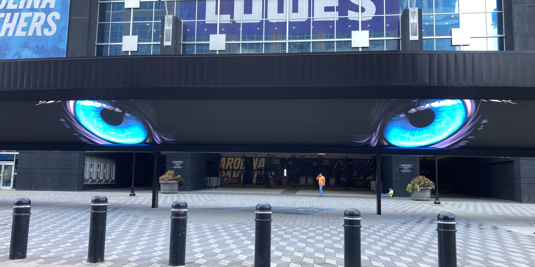 Moving south along the east coast, we come to Carolina where the Panthers have a few new things to brag about at Bank of America Stadium that came as part of the ushering in of a new tenant, Charlotte FC. The main entry received a huge facelift with an exterior canopy display. This display is 11 feet high by 211 feet wide and angled slightly toward the ground to appeal to audiences as they arrive for live events. It features a 6-millimeter pixel spacing to show crisp, clear imagery as fans pass below it and enter the stadium.