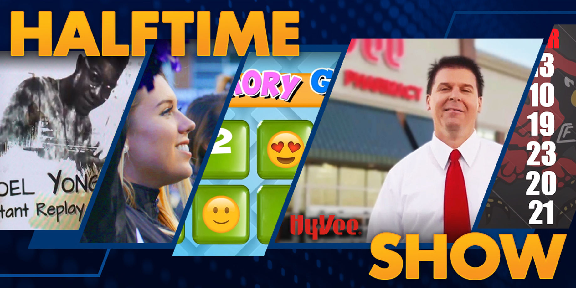 Show photos of players, coaches, cheerleaders, student managers, media crew and crowd shots from the first half. Fans enjoy looking at the video board to find people they know.
