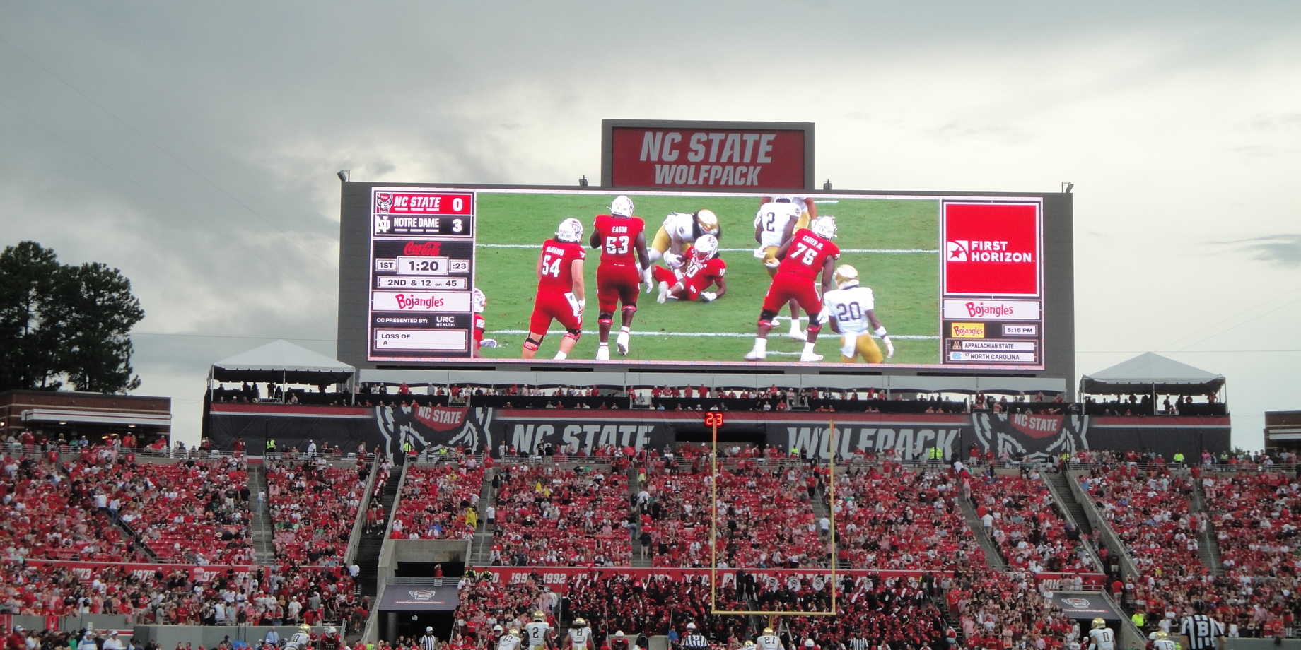When the NC State Wolfpack hosted Notre Dame on Saturday, September 9, there was excitement for a new, huge video display in the end zone. The ensuing weather quickly put a damper on the game when lightning struck extremely close to the stadium and the lights went out on the display. NC State and our Daktronics team was on-site and ready to act quickly.