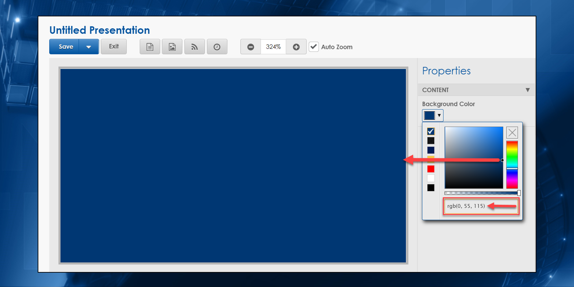 Now all there is left to do is type the RGB values into the Color Menu in the Web Compositor like we discussed earlier. Can you believe how easy it is to incorporate a precise color into a Web Presentation? Not to mention that fact that the Web Compositor will remember that color for you so you can find and use it again and again!