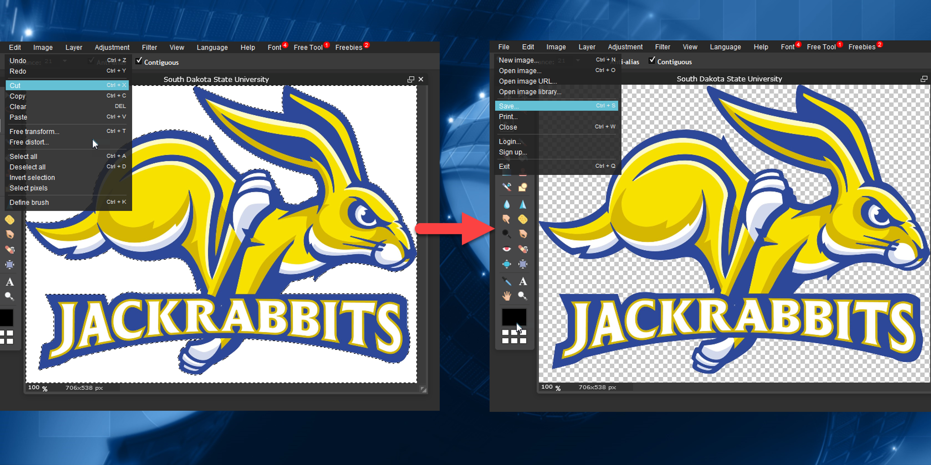 If you have your own graphic element(s) that you would like to use instead, like a logo, for example, you can use 3rd party Content Editors like Adobe Photoshop to remove those pesky white backgrounds. We have actually found 2 FREE online content editors that will do this for you as well.
