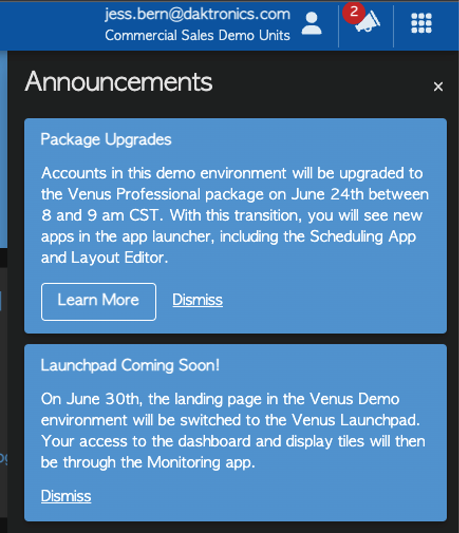 Once you understand the banner’s contents you can head back to your Venus Control Suite Announcement Panel to dismiss the banner. Dismissing only changes the Announcement Panel’s notification status. If you have 1 notification for Announcements and you dismiss it, you will remove the red circle with the number indicating you have announcements. However, if you have a number 5 in the red notification circle and dismiss only one you will keep the red circle and only change the number of notifications waiting to 4.