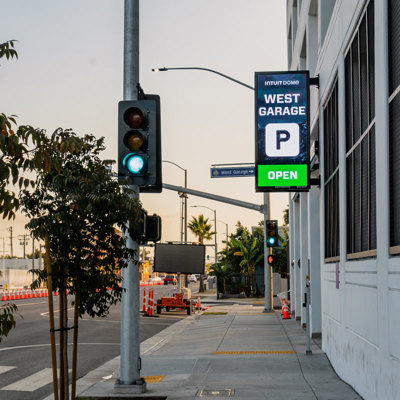 Upon arrival, visitors are greeted by 30+ displays within the parking garages that provide wayfinding and information. The plaza features a large 40-foot by 70-foot video board overlooking the outdoor basketball court, while two double-sided marquee displays are located at the corner of Prairie and Century to attract and inform passersby.