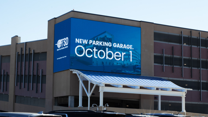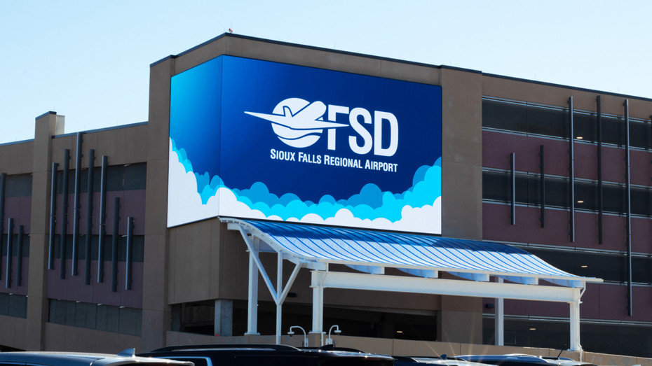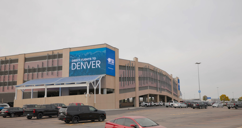 The Sioux Falls Regional Airport (FSD) completed a $62 million parking garage project, entirely financed with local airport funds. An enclosed glass and steel skybridge connects the garage to the terminal. Inside are angled quick ramps for easy access, digital displays to guide drivers to available spaces, and 22 electric vehicle charging stations across multiple levels. On the outside, this innovative facility features large, wraparound Daktronics video walls to communicate with travelers, strategically placed to maximize visibility from the busy highway.