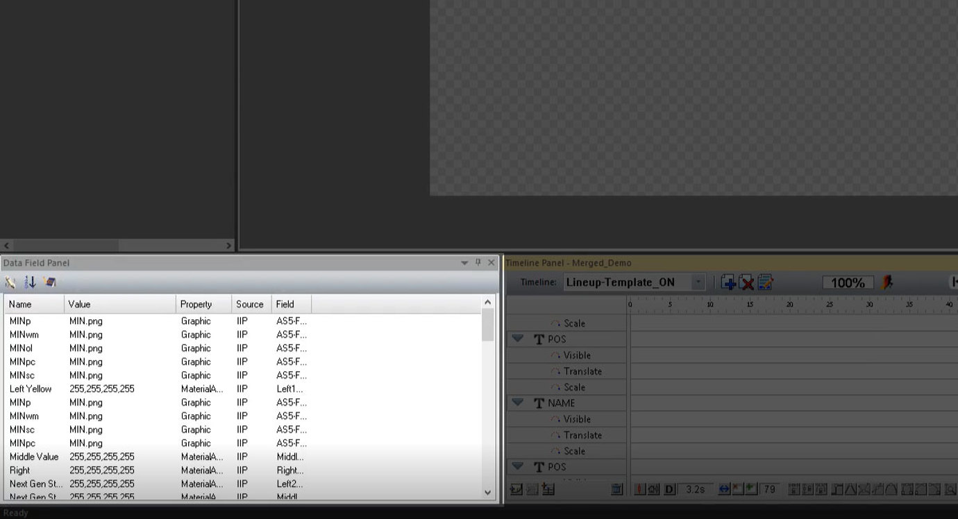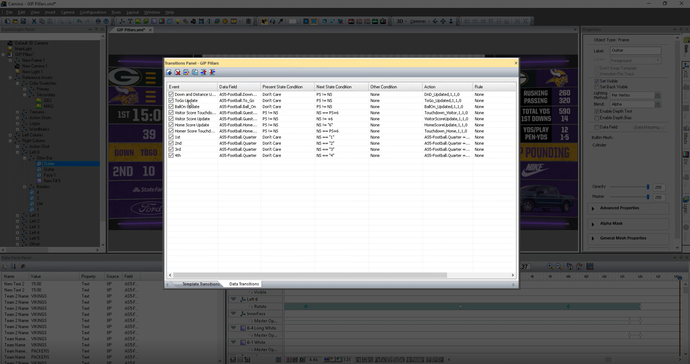 The transitions panel enables automatic triggers through conditional formatting, allowing objects in the timeline to play automatically based on real-time game, player, and/or team data.