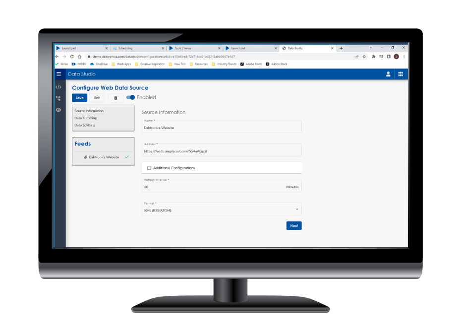 Data Studio allows you to get the latest and most current data on your display to inform your audiences with weather feeds, sports scores, election feeds, etc. The ability to accept third-party feeds is critical to meeting this expected feature. Easily input and show data and combine data from multiple feeds to create more compelling, informative content. Trigger data-driven content for display on all your screens.