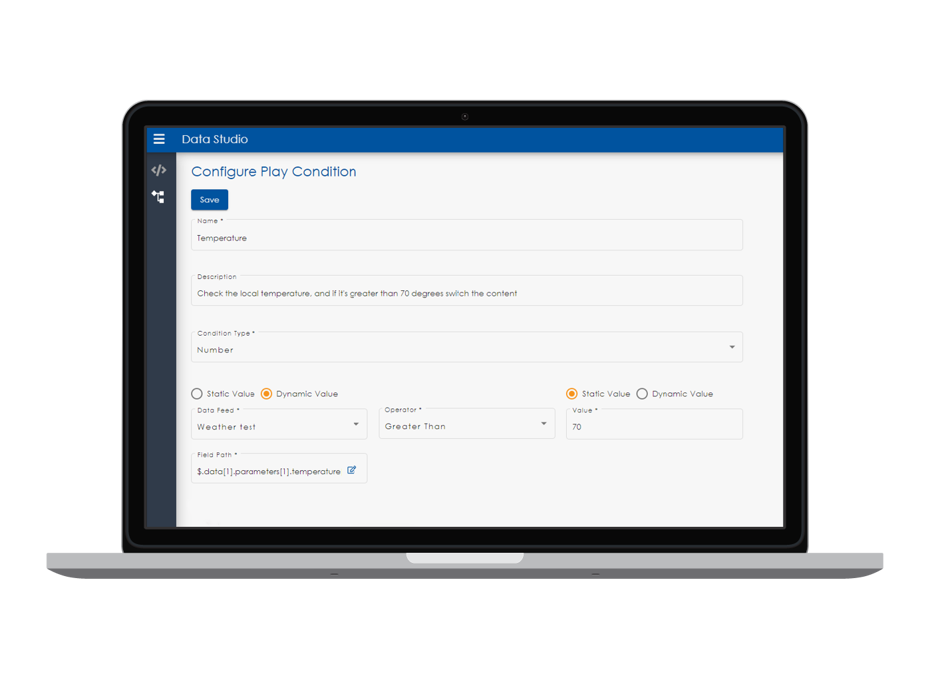 Conditional Scheduling in Data Studio allows content to be played based on the value of data from a data source. For example: a rule can be created that triggers an umbrella piece of content to show up only when a weather feed says it is raining.