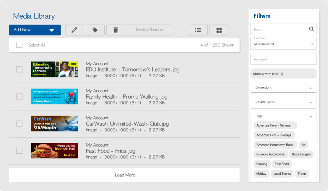 Drag and drop files directly into your media library, scale content to display size(s), and organize them into a playlist to quickly schedule your campaigns. Keep track of your content by using personalized tags.