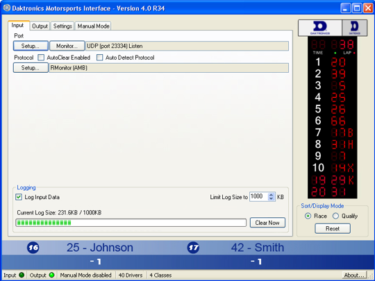 The Daktronics Motorsports Interface software collects data from several transponder timing systems and race results programs to send the latest race information to Daktronics scoreboards and LED displays. The interface can also be operated in Manual Mode. Compatible transponder and results timing systems include AMB RentiX, ChronX, and Orbits and Westhold Race Manager, Timegear (Multi-loop), Formula One, Dorna, and RIS.