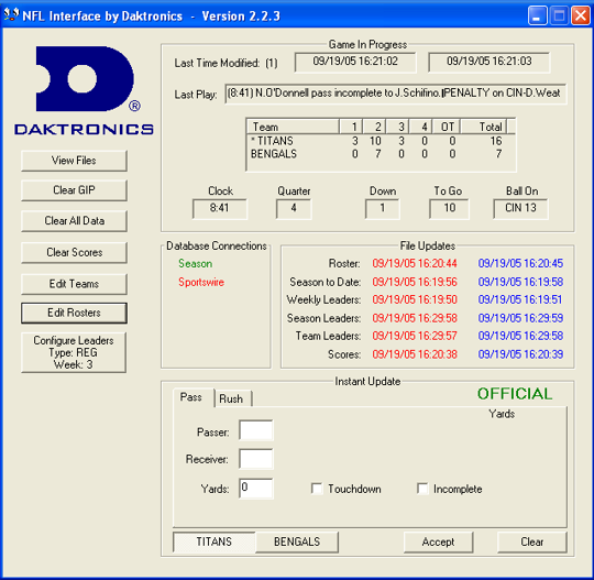 The Daktronics NFL GSIS Interface allows player, team, game, and season stats from the official Game Statistic Information System (GSIS) to be shown on Daktronics display systems. Stats and scoring information for the current game and out-of-town games are continually received from the GSIS and sent out to displays.
