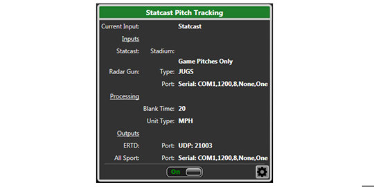 The Statcast Pitch Tracking Interface for Data Server receives MLB pitching information from the third-party Statcast system and automatically formats the data to be shown on Daktronics displays. This Data Server module also allows switching to backup radar guns to show speed of pitch for non-MLB games or if the Statcast system is down.