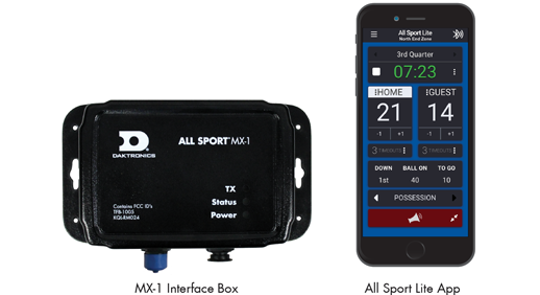 The All Sport MX-1 system connects to mobile devices and tablets to control outdoor Daktronics scoreboards for a variety of sports and practice sessions. Using a Bluetooth® connection, the All Sport Lite (formerly DAK Score) app sends commands to an interface box, which then directly controls the scoreboard via wired or wireless signal.