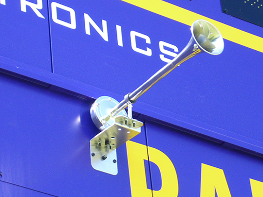 Daktronics offers wide variety of horns for indoor and outdoor sports. Most indoor (and small outdoor) scoreboards are typically equipped with a buzzer-style horn, while larger outdoor scoreboards often use a trumpet-style horn. Remote horn enclosures, that is horns not mounted inside a scoreboard, are also available for aquatics and LED message/video display applications.